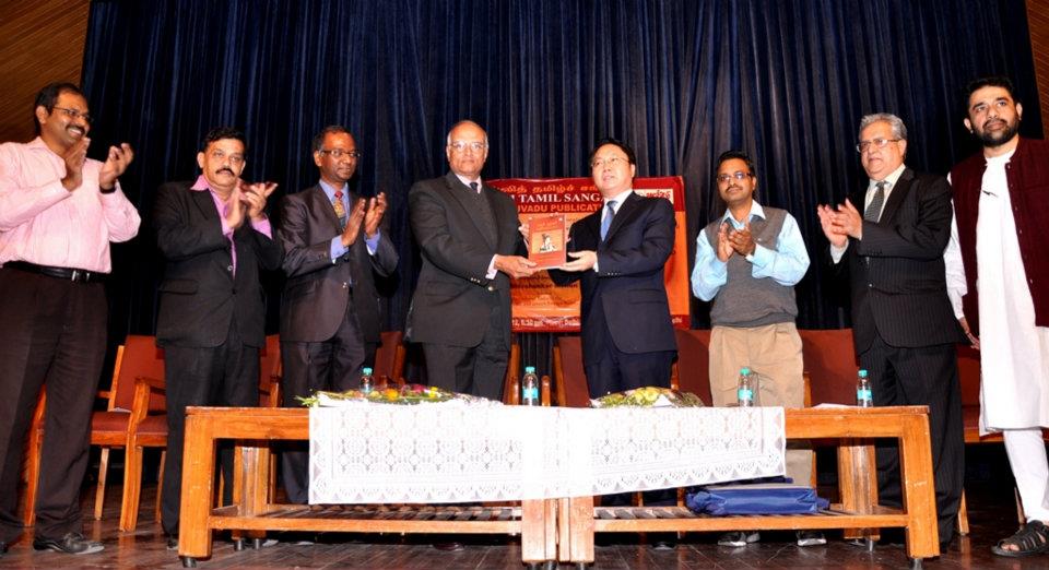 Ambassador Sivasanakr Menon releases the book and the first copy is received by Mr.Wang Xufeng; others (L-R) Mu Ramanathan, R Mukunthan, M Sridharan(Payani), Prof A R Venkatachalapathy, P A Krishnan and Mr Kannan